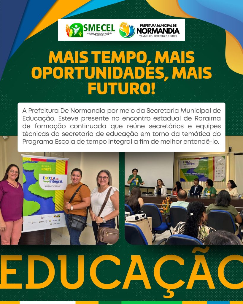 Normandia (RR) — A Prefeitura Municipal de Normandia, por meio da Secretaria Municipal de Educação, participou ativamente do Encontro Estadual de Formação Continuada, realizado em Roraima, reafirmando seu compromisso com a melhoria da educação no município. 🌟 Durante o evento, representantes da secretaria discutiram o Programa Escola de Tempo Integral, iniciativa que visa ampliar as […]